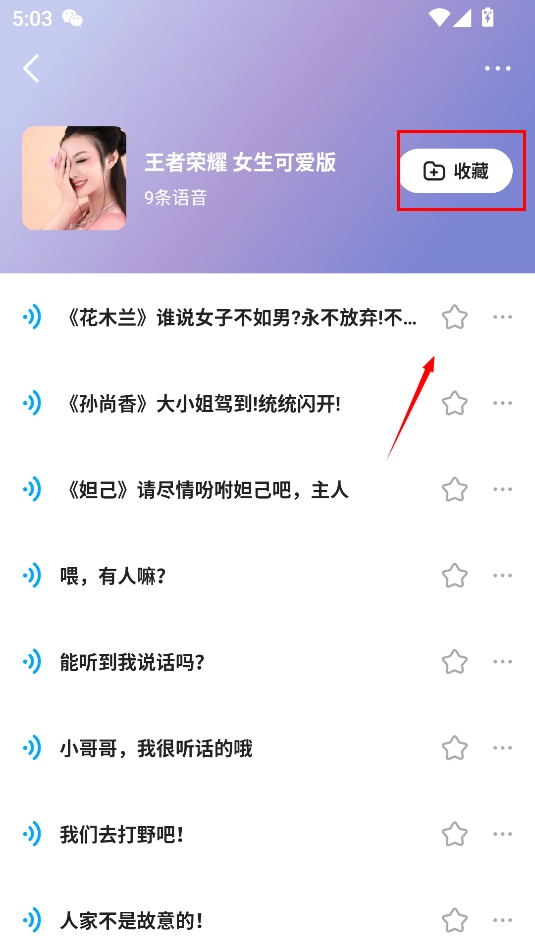 2、进入后,既能够单独收藏音频,也可以对整个语音包进行收藏。