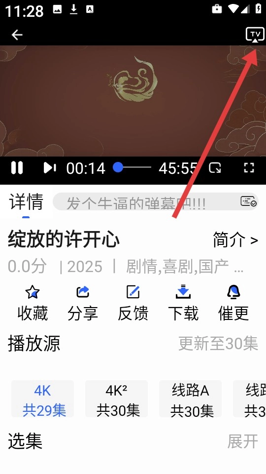 2、随后点击播放界面右上角的“tv”标识,具体位置如图所示。