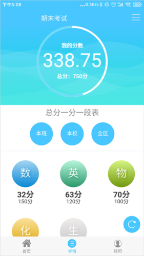 6、接下来,点击底部的【学情】菜单,便能查看到各科成绩,示例见图。