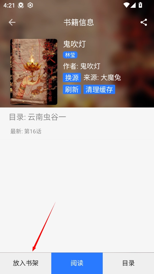 3、当进入书籍的详细页面后,点击“放入书架”按钮就可以了。