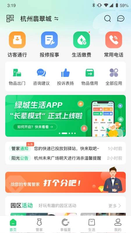 1. 绿城生活最新版以赢得业主信任为出发点,借助智慧管家,运用新科技营造园区自治环境。