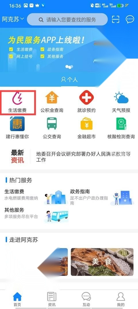 1. 打开软件进入首页,映入眼帘的是诸多功能,像生活缴费、公积金查询、就诊预约、公交查询等等,此时点击生活缴费。