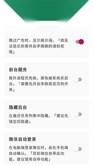 1、【极简风格】极简设计理念,操作如同傻瓜式般简单。无需繁琐多样的设置,仅需开启无障碍权限,广告就能自动跳过。