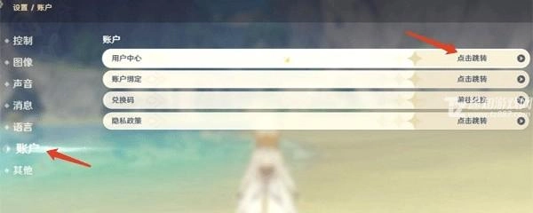2、接下来依次点击“账户”,再点击“用户中心”,最后点击“点击跳转”。