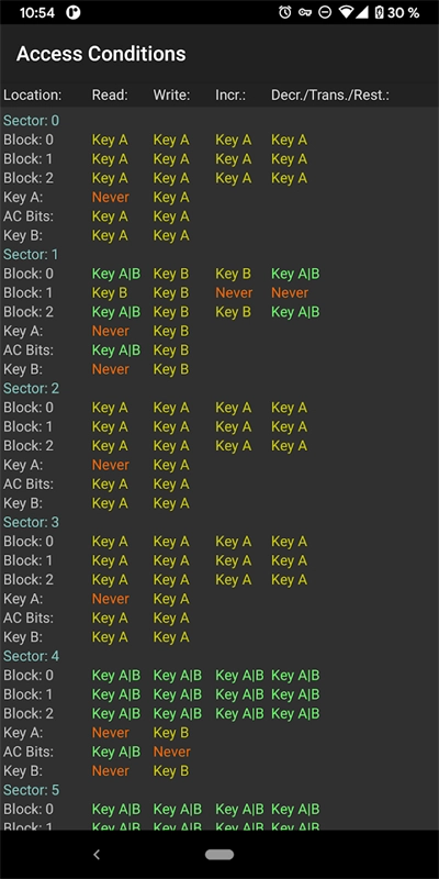 8、显示Mifare Classic卡片的准入条件以表格形式呈现(译者注:即依据控制位来判定该区段是由keyA控制还是keyB控制)。