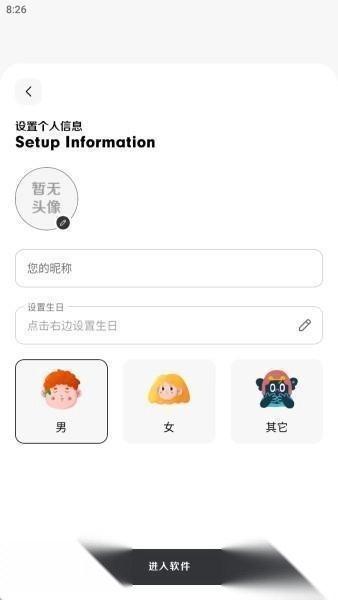4、用户根据要求,设置自己的头像、昵称等信息,点击\\"进入软件\\"就可以使用了。