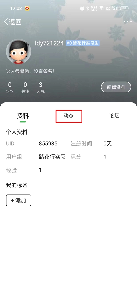 3、进入个人主页后,选中“我们动态”,接着点击文本下方的删除按钮就行。