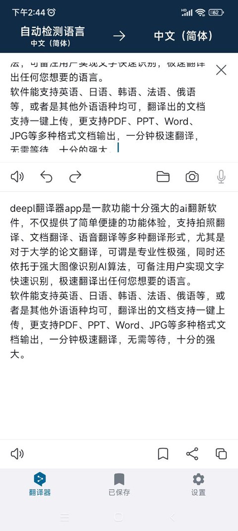 4、完成输入后,等待系统展示翻译结果,翻译结果会显示在右侧,点击底部按钮,就能执行复制、保存或分享等操作。