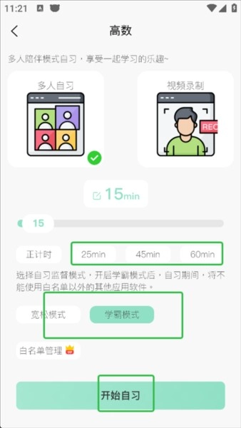 用户能够自行设定自习时间,挑选监督模式,而后点击“开始自习”按钮即可。