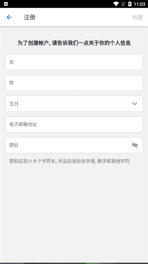 4、按照要求填写个人信息,然后点击右上角的【创建】按钮。