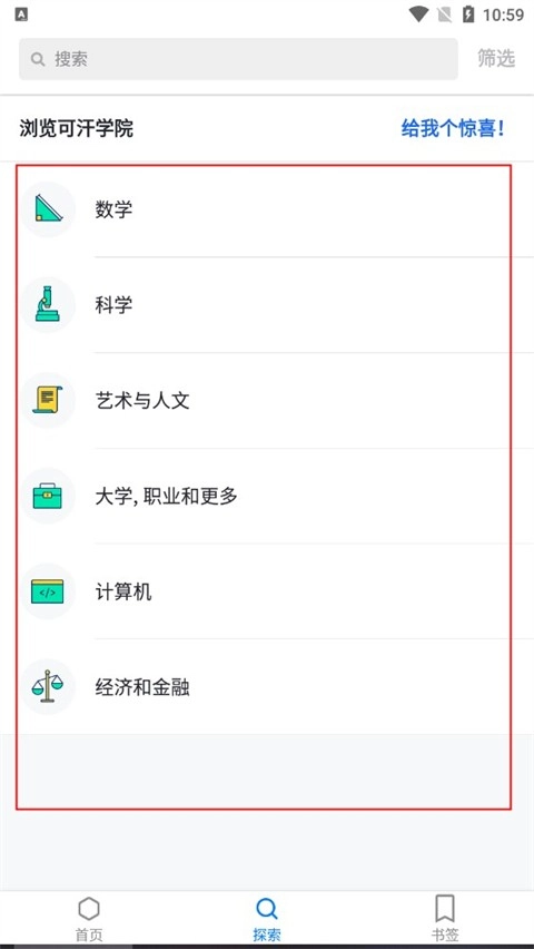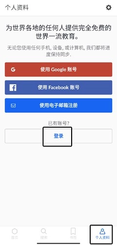 1. 开启可汗学院安卓版本,用户轻点底部的【搜索】按钮,寻觅自己所需的学习资料。
