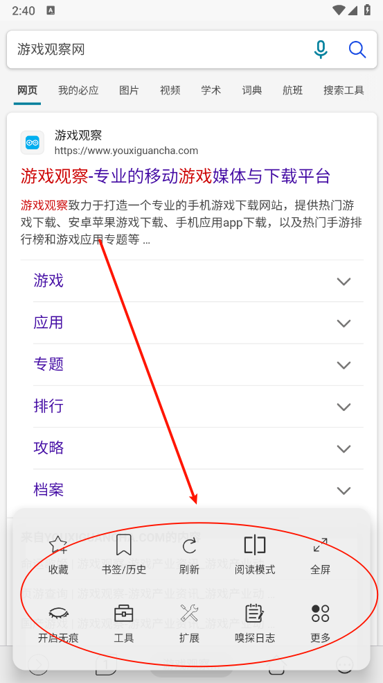 4、在页面右下角找到功能菜单(显示为三点图标),借助它您能够便捷地进行收藏、刷新页面,或者切换到无痕模式等操作。