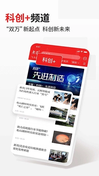 科创 + 频道围绕源头创新、技术创新、成果转化、企业培育这些关键要素与先进制造业展开深度报道,作为报道的核心内容。频道将精心打造热新闻、科创观察、先进制造、科创者说、黑科技等多个特色栏目,通过图文、视频、条漫等多元融合的传播形式,全方位呈现东莞在科技创新与先进制造领域所聚焦的崭新发展图景。