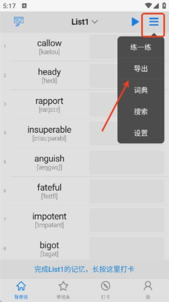用户可点击右上角的菜单按钮,借助练一练、导出、词典等功能辅助记忆单词。