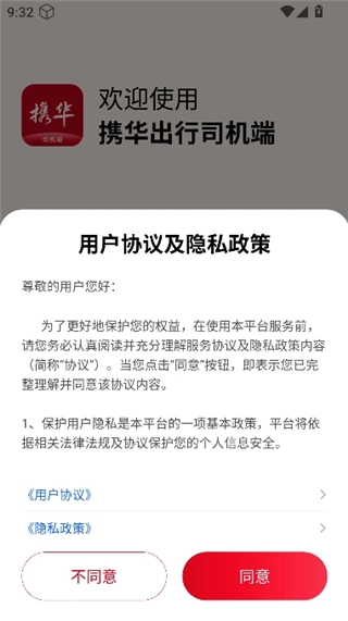 如何注册携华出行司机端? 1. 在本页面找到携华出行司机端进行安装,安装完成后打开软件,然后同意隐私政策。