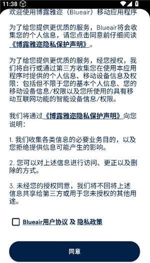 如何登录Blueair 1、在本页面获取Blueair软件,安装完成后打开软件并同意隐私政策。