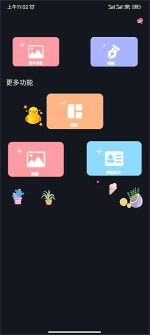 1. 开启Promovie专业摄像机,进入主界面,这里有图片美化、相机、拼图、相框、变美历史等诸多选项,下面以【图片美化】为例展开说明。