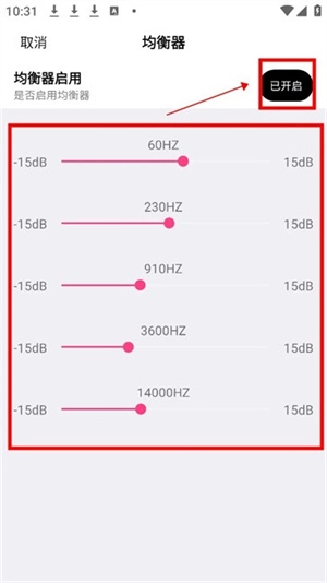 4、设定好均衡器数值后,在右上角选择开启就行。