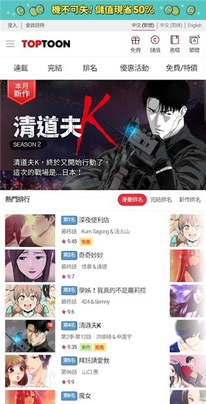 TOPTOON这款免费漫画阅读软件超好用,备受欢迎。此次为大家呈现的是国际版本,在这儿,海量精彩的免费韩漫作品任你观赏。每日都会更新连载章节,绝无烂尾之忧,让你快乐追漫毫无负担。不管你是腐女还是宅男,都能在TOPTOON找到属于自己的快乐。喜欢漫画的小伙伴,快来TOPTOON体验一番吧!