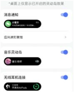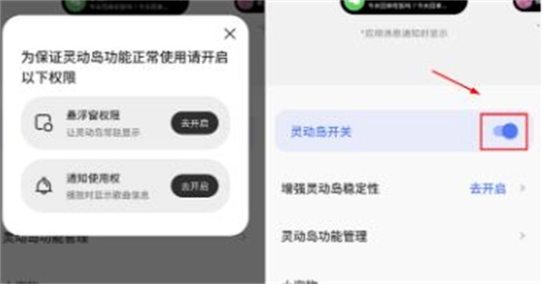 2、于【灵动岛】页面新增【灵动岛开关】,点击便可开启。不过,为确保灵动岛功能能够正常运行,还请用户开启以下权限:【悬浮窗权限】、【通知使用权限】 。