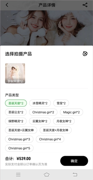 3、选定拍照风格后,进入该风格的详情页面,点击【立即预约】,选好产品类型后点击【确定】。