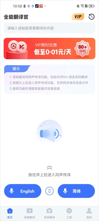 1. 在本站点击安装并打开,依照提示向上拉动即可进入同声传译功能。