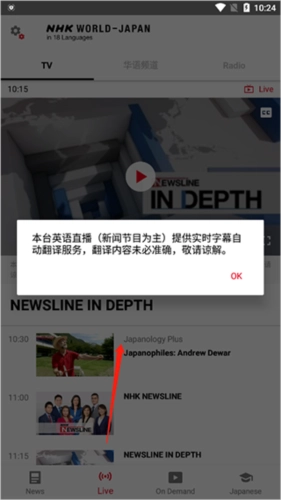 4、在“live”模板中,需要留意的是,本台以英文直播新闻节目为主,所以提供的是实时字幕自动翻译服务。