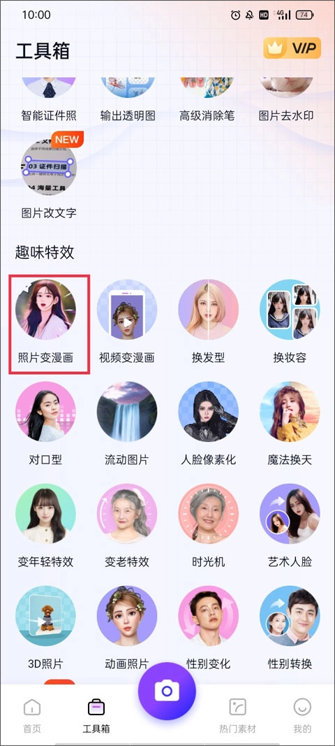 1、依旧是在【工具箱】里,向上滑动页面,找到“趣味特效”,接着点击下方的“照片变漫画”选项。