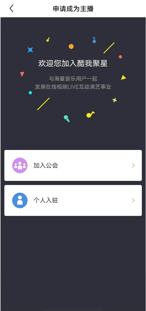 3、进入然后申请成为主播,之后你会看到【加入公会】和【个人入驻】两个选择,这里小编建议个人入驻,其实无论是加入公会还是个人入驻,只要你直播内容比较新颖,并且坚持不懈的努力,你都可在直播中得到不菲的收益,只不过加入公会后,有一部分收益是要交给公会的。
