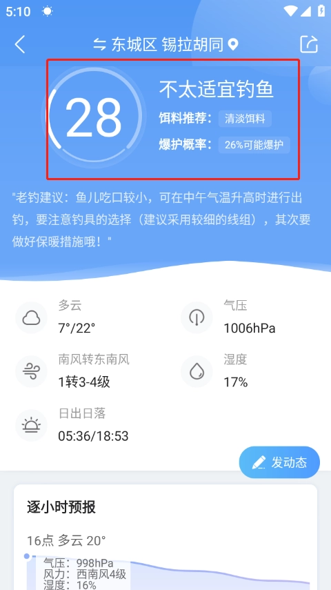 2、由此可知,该钓鱼指数参数为28,这意味着在东城区锡拉胡同不太适合钓鱼,爆护的可能性仅有26% 。
