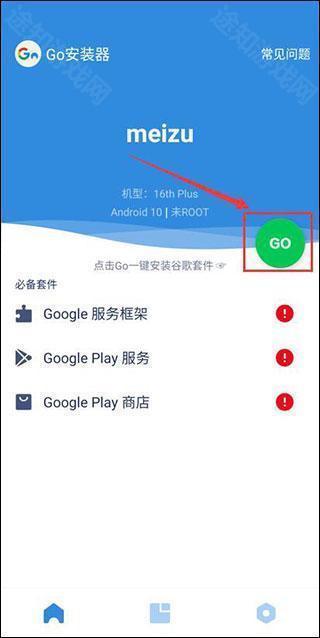 1. 打开软件后,系统会自动检测谷歌三件套的安装状况。若有未安装的谷歌套件,后面会标上红色感叹号。此时,用户仅需点击右侧的绿色“GO”按钮,稍作等待,即可完成相关操作。
