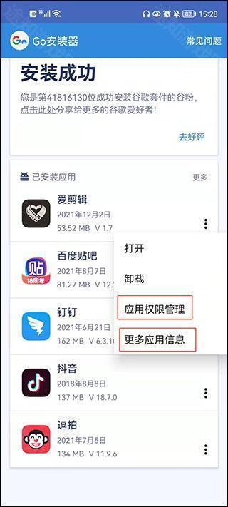 2、完成后,需用户手动进行安装,因此要赋予相应权限,如读取应用列表、允许安装未知应用等。安装结束后,会显示谷歌套件已安装。
