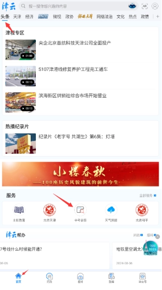 1、打开津云软件,在首页板块点击头条后向下滑动,即可看到中考录取相关内容。