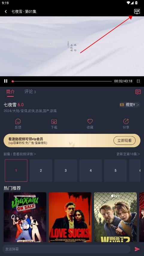 3、于播放页面,点击右上角的TV图标,便能搜索投屏设备。