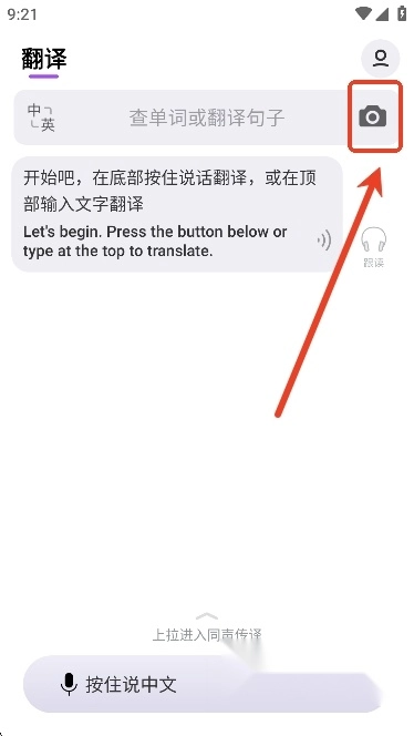 用户们若要使用拍照翻译功能,可打开相关界面,然后点击右上角的拍照按钮。