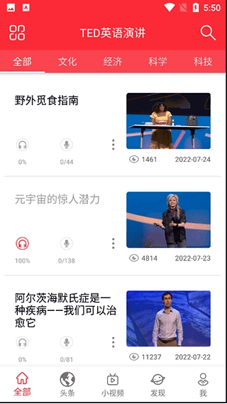 ted英语演讲(爱语微课)是一款学习英语的辅助软件,软件中提供了不同类型的视频课程,文化,竞技,科学以及科技等等,在积累知识的同时还可以加深你的英语口语能力,还可以对你的口语能力进行评测,了解自己的不足以及错误发音,帮助用户进行纠正,这里还有很多美剧可以观看,一边放松一边学习,以不同的方式来提升你的口语,还有更多的优质学习资源等你来参与。