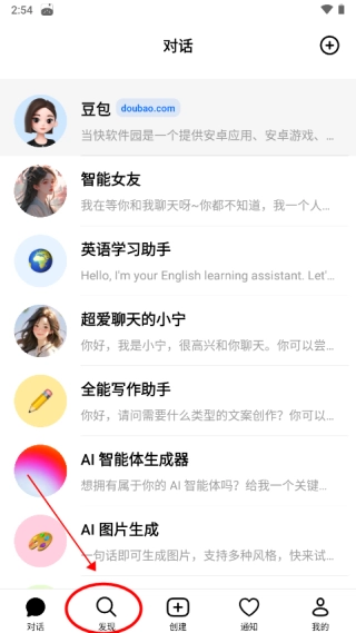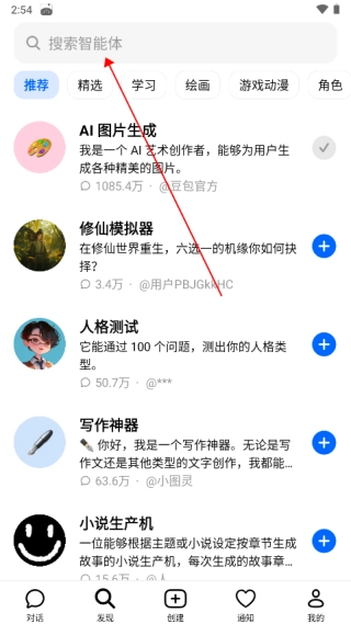 在发现页面,点击搜索栏,输入想要的AI智能体