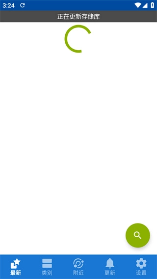 在本站完成F-Droid的安装后,打开该软件,界面会显示“正在更新数据库”。由于此时尚未连接到F-Droid的国内源,因此无法浏览安卓软件,接下来请点击右下角的“设置”选项。
