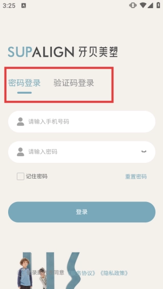 打开“牙贝美塑”应用,进入登录页面后,可选择【密码登录】或【验证码登录】这两种方式进行登录。