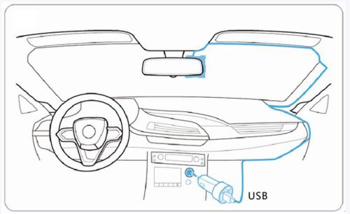首先把用于存储的SD卡插入行车记录仪,接着用USB线将车载充电器和电源线连接起来,给Wi-Fi行车记录仪接通电源。