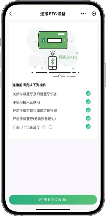 连接ETC设备时,请同时开启手机蓝牙和ETC设备蓝牙(重要提示:长按设备上的蓝牙按钮就能唤醒ETC蓝牙功能)。