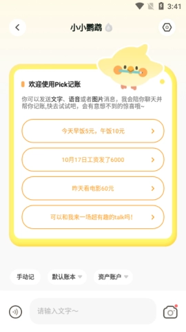 用户进入Pick记账后,能够和可爱的小小鹦鹉进行互动聊天。