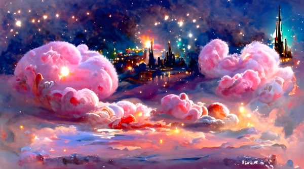 在梦幻般的夜空里,星星正闪烁着微光,天空中飘浮着巨大的粉色桃子形状的云彩,远处矗立着高塔,还有一片迷你城市的景象。(CG渲染)