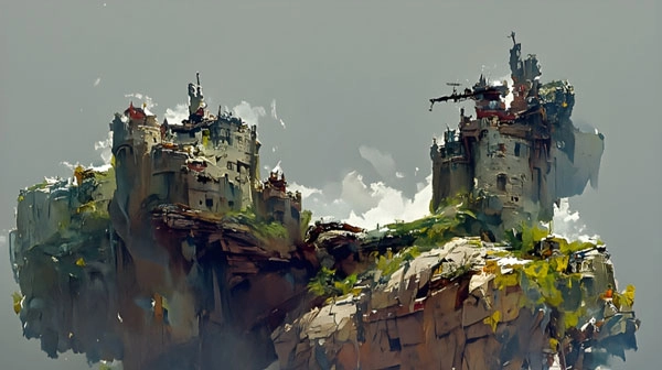 矗立在岩石山上的城堡。(采用CG渲染技术,风格参考Craig Mullins)