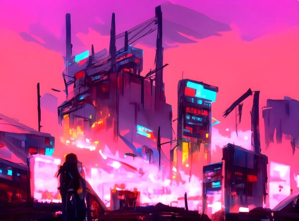 近处是燃烧的垃圾场,废弃的电子设备散落其间,远处则是霓虹闪烁、高楼密集的城市。(CG渲染、赛博朋克风格)