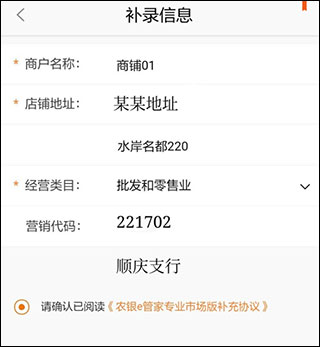 补录相关信息:商户名称(通常使用简称,不得包含“有限公司”等字样;若没有招牌,可命名为“个体户**”);地址;经营类目通过下拉菜单选择。