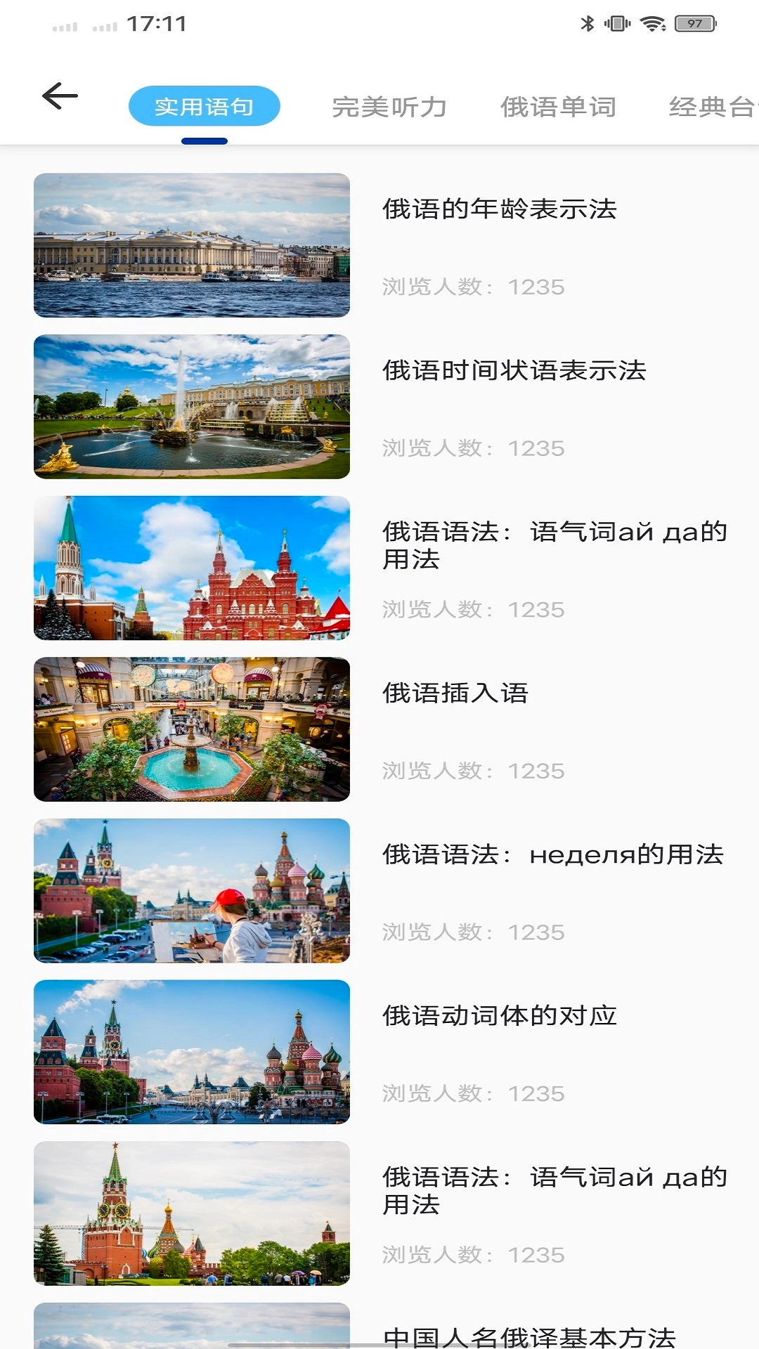 提供多个学习板块,包括完美听力、俄语单词、经典台词等