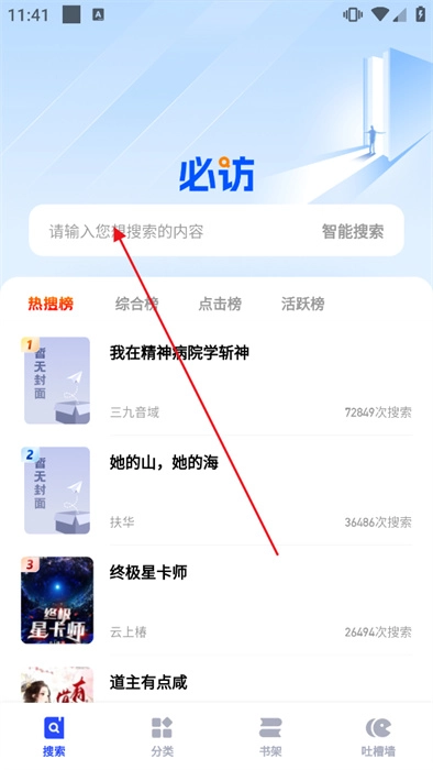 进入软件,点击上方搜索框一键搜索喜欢的小说资源。
