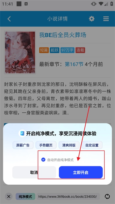 接着打开进入详情页面,点击“立即开启”按钮,就能开启纯净模式进行阅读了。