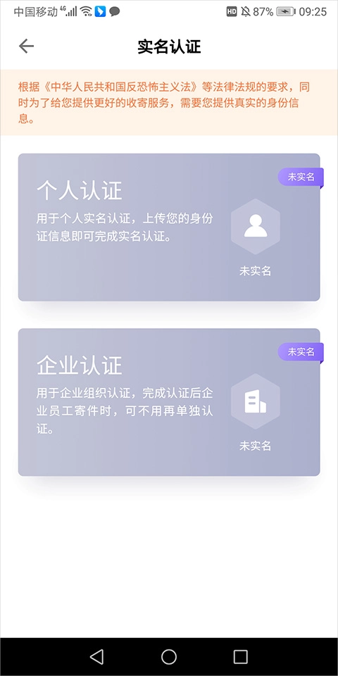 个人用户请选择【个人认证】选项,企业用户则请选择【企业认证】选项。